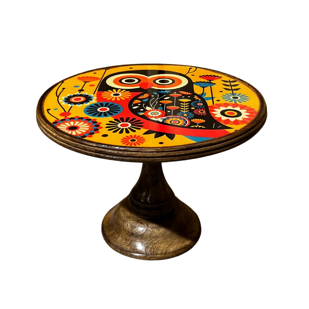 : Round top with citrus fruit epoxy inlay; foldable wooden legs